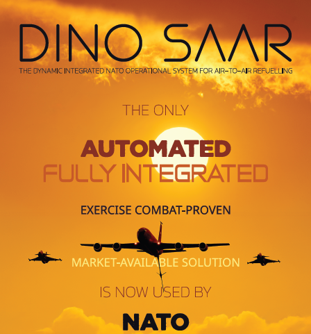 The Dynamic Integrated NATO Operational System for Air-to-Air Refueling (DINO SAAR) is a software solution designed to optimize Air-to-Air Refuelling (AAR) missions within the NATO Alliance, providing recommendations for AAR mission preparation, execution and training. This platform simplifies the complexities of AAR through integrated data processing and algorithms.
