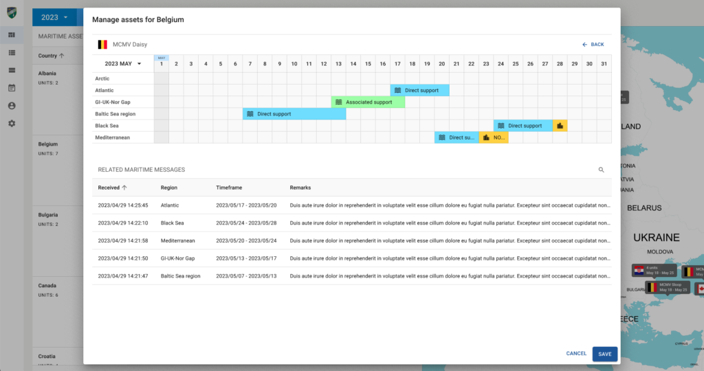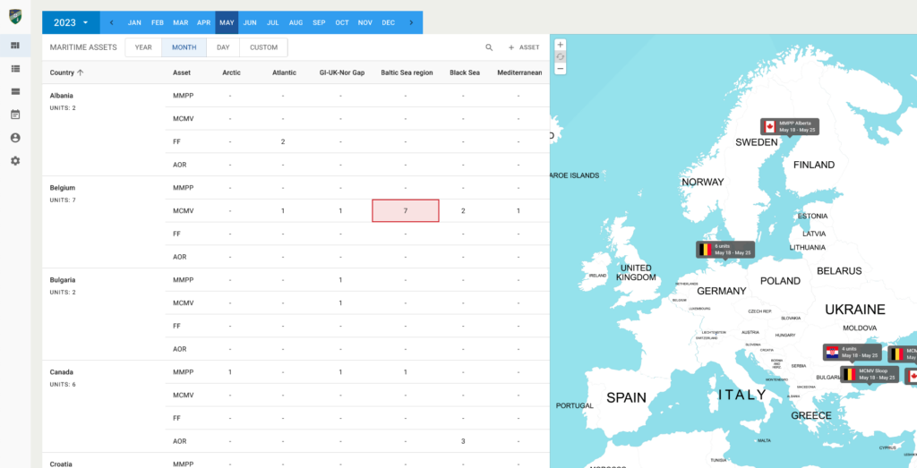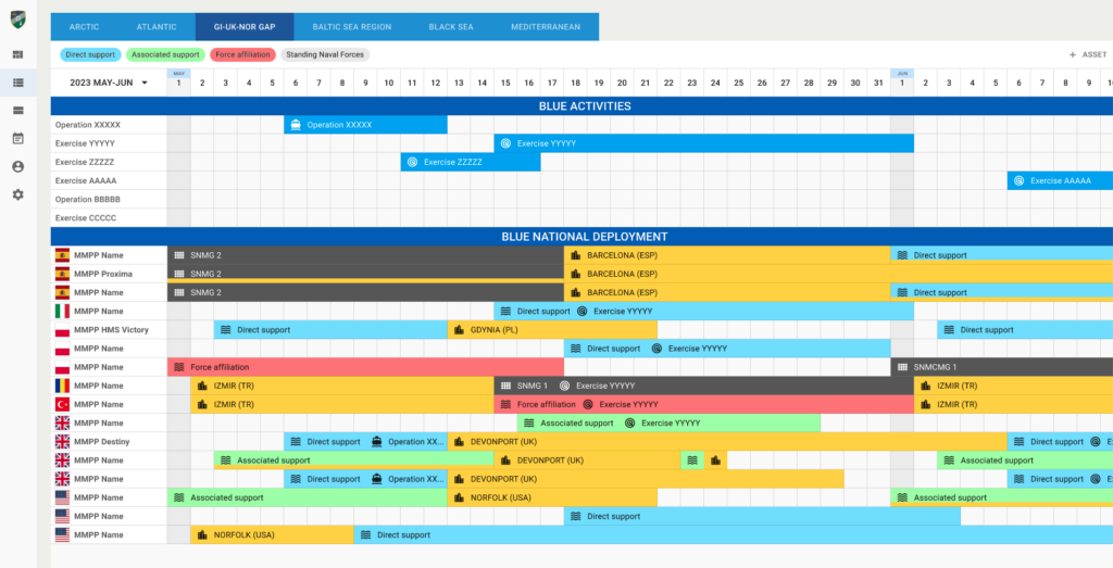NATO Maritime Availability Database system for Allied Maritime Command (MARCOM) is a cloud-based web application that will enable the MARCOM Staff Officers to determine, visualize and report the future location of Standing NATO Maritime Framework based on the received messages/reports and their planned involvement in Blue exercises and operations. It will allow the gathering and filtering information regarding various naval units’ activities.